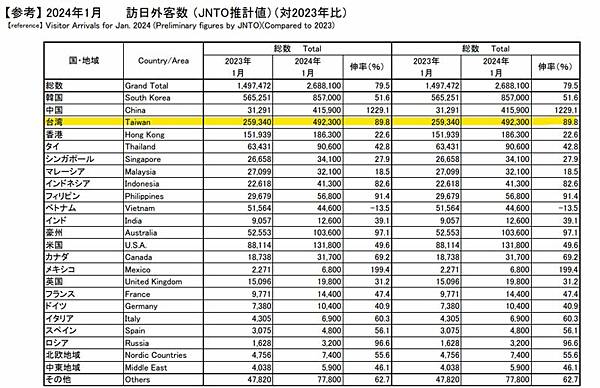 7月訪日人數最多的是中國,有78萬800人,較去年同期成長6.8%;南韓居次,64萬4000人,增加44.1%;台灣44萬6000人也增長了12.5%,排第3;香港23萬4600人,同樣大增27.1%。以上4個國家地區皆創下單月新高紀錄,占了訪日外國人的78.5%。