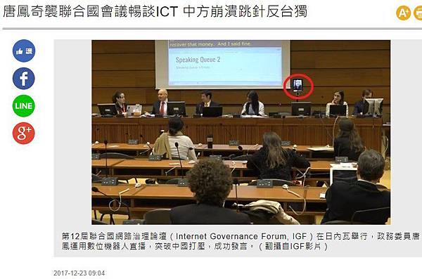 台灣內閣官員參與聯合國正式會議!第12屆聯合國網際網路治理論壇(Internet Governance Forum, IGF)18日至21日在日內瓦舉行,來自全球政界、商界、學界以及非政府組織等2,000多名代表與會。專責台灣數位經濟與開放政府發展的行政院政務委員唐鳳,獲邀代表台灣在會中發言,分享台灣的數位發展經驗。特別的是,為突破來自中國的政治阻力,唐鳳自己想出以「視訊」方式與會,贏得與會國家代表熱烈迴響。