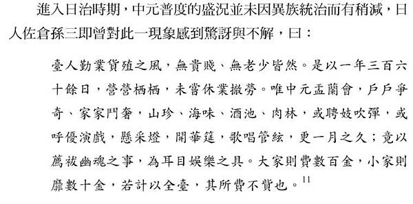 例如,作者在本書多次強調台灣人「勤於貨殖」:「台人勤業貨殖之風,無貴賤、無老少皆然。是以一年三百六十餘日,營營栖栖,未嘗休業撤勞」(盂蘭會);「島人蓄財之思想,出於天性。自幼至老,雞鳴而起,營營栖栖,貨殖是勤、生理是務」(蓄財);「台人急於生理,殖利之事,莫不講究,如市場最為然」(市場)。這和現代台灣的重商精神,以及最流行的口號「拚經濟」完全合節。