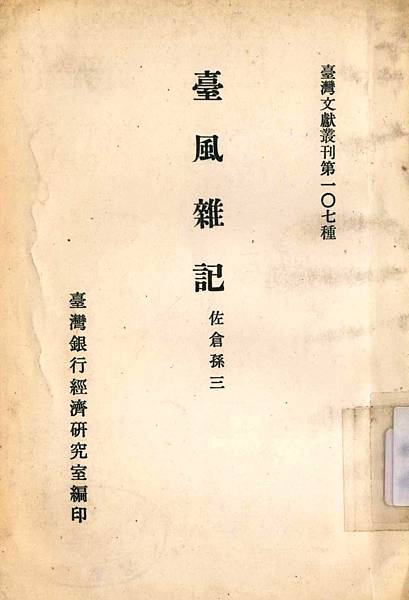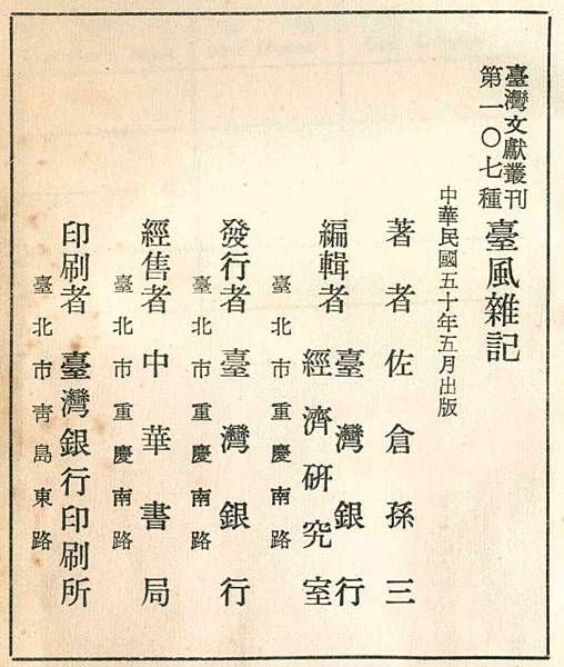 佐倉孫三,《臺風雜記》(《台灣文獻叢刊》第107種,1961年5月出版,台灣銀行經濟研究室編印)