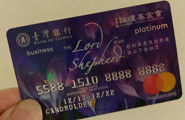 台灣銀行與基督教論壇基金會合作發行近十多年來國內首張「基督教認同卡」,以聖經「詩篇23篇」信徒持守信仰,享有恩典為主軸,持卡人的每一筆消費,台灣銀行將提撥0.25%到0.3%的回饋金給基督教論壇基金會,作為公益推展使用,除此之外持卡人自己也可享有最高1.4%的現金回饋。