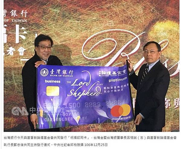 (12/25)起,台灣銀行與基督教論壇基金會攜手共同推出「祝福認同卡」,結合基督教愛人如己的信念,卡友刷卡消費回饋金可提供基督教論壇基金會作為公益推展使用