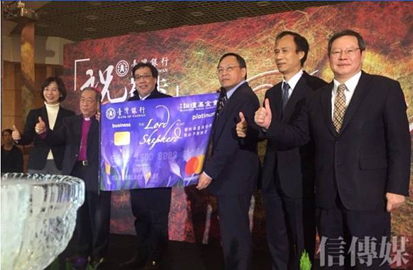 台灣銀行與基督教論壇基金會25日舉行「祝福認同卡」上市記者會,由台灣銀行董事長呂桔誠(右3)與基督教論壇基金會執行長鄭忠信(左3)等人共同啟動。(陳信翰攝)