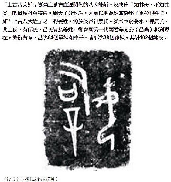 「上古八大姓」實際上是有血源關係的八大部落,反映出「知其母,不知其父」的母系社會特徵。周天子分封后,因為以地為姓演變出了更多的姓氏。如「上古八大姓」之一的姜姓,源於炎帝神農氏。炎帝生於姜水,神農氏、共工氏、有邰氏、呂氏皆為姜姓。從齊國第一代國君姜太公(呂尚)起到現在,繁衍有章、呂等64個單姓和淳于、東郭等38個複姓,共計102個姓氏。