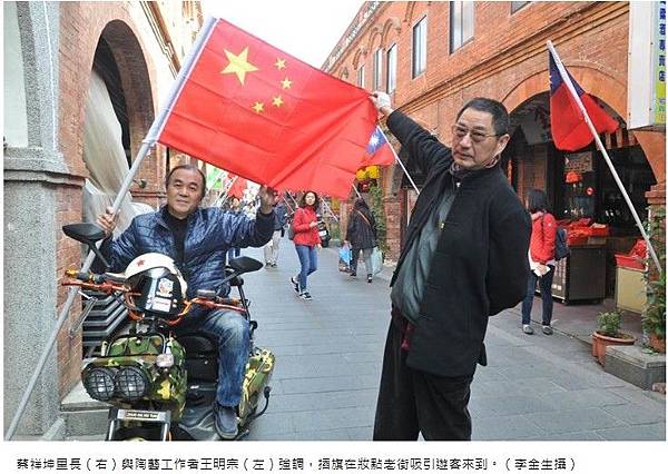 老街首見兩岸國旗飄揚,還有人說像是南北韓中線,看到老街「活」了起來,蔡祥坤和王明宗眼中都亮了光彩表示,會一直放到農曆春節,也期盼駕駛汽車的朋友,盡量不要再把車開進老街,影響遊客安全。