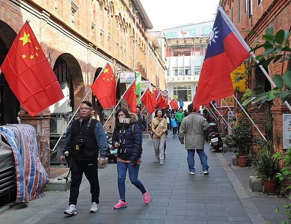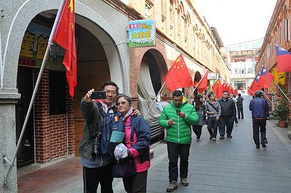 金門「模範街」因為兩岸國旗高高掛,一下子出現不少參觀人潮。(記者吳正庭攝)