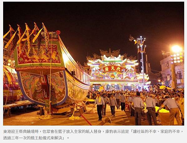 (4)、關於王船之由來,乃因康熙39年(1700),清廷下令將鄭氏祖孫墳墓遷葬原籍福建南安,臺灣百姓無力阻撓,僅能以隆重牲禮祭祀,以表達不捨與思念;並有百姓駕小船隨鄭氏靈骨入海。其後,為緬懷鄭氏功德,乃造王船,設王爺像祭祀後奉送入海,並逐漸形成習俗。