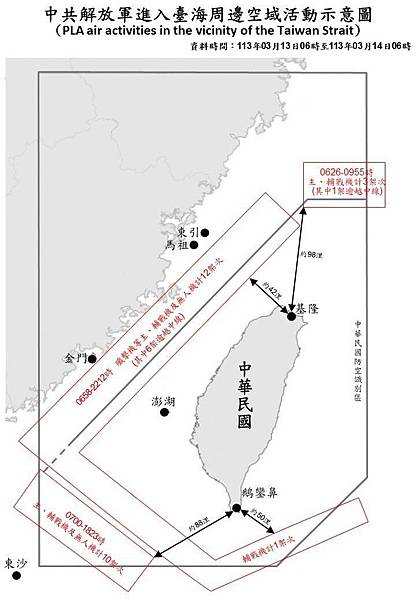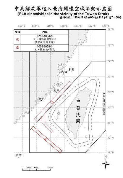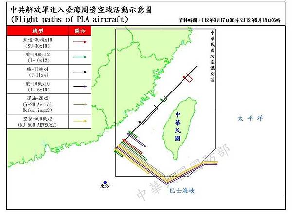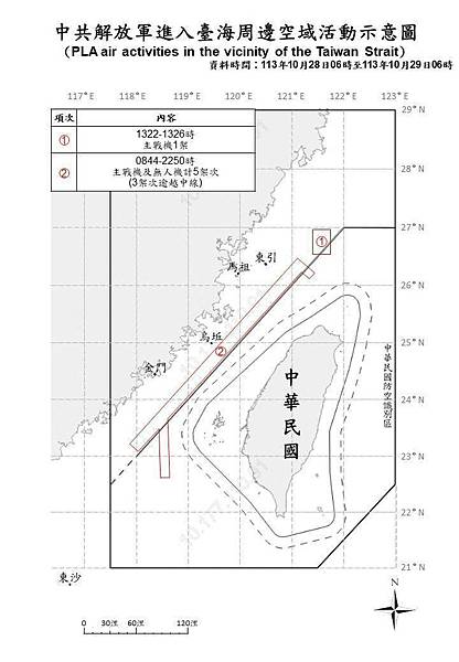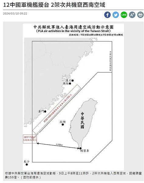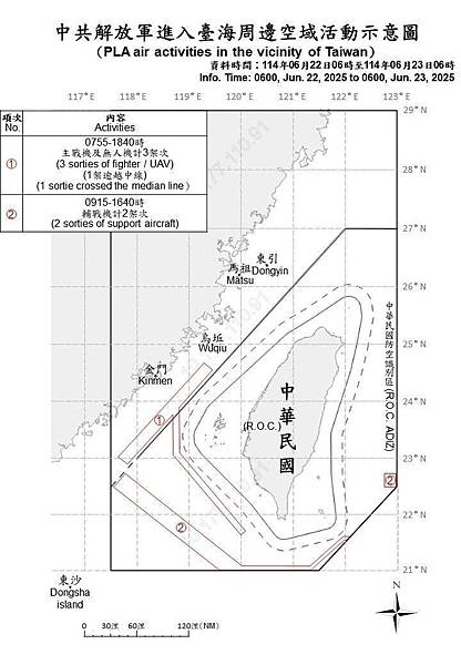 國軍資料顯示,3架次共軍主戰機及無人機侵擾我西部空域,其中1架次逾越中線;2架次共軍輔戰機進入我西南及東南空域。