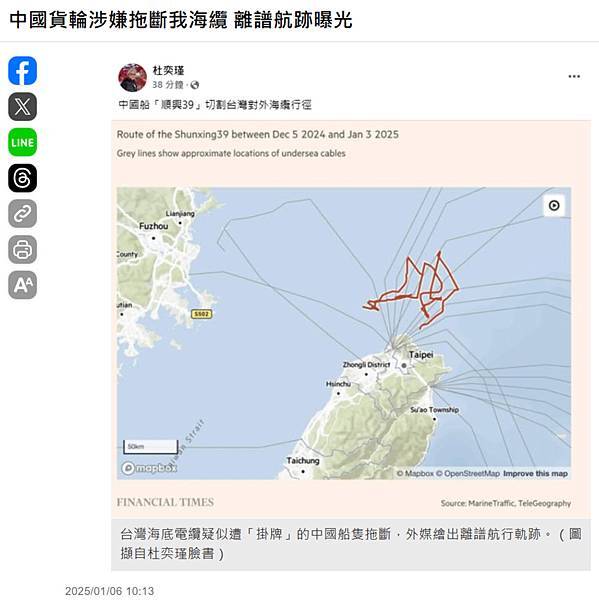 美國史丹佛大學國家安全創新中心「海洋之光」(SeaLight)專案主任鮑威爾(Ray Powell)、PTT「創世神」杜奕瑾等人,都紛紛在社群平台上分享英媒《金融時報》的擷圖,其中灰線為海底電纜,紅線則是順興39的軌跡。