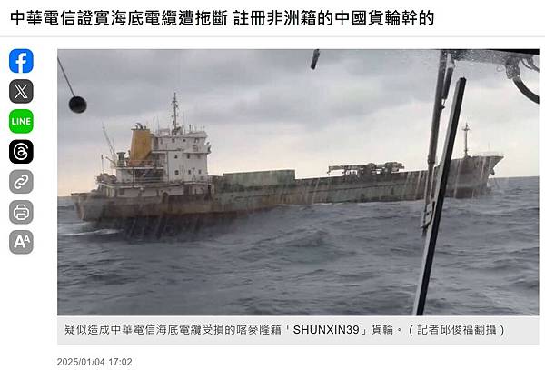 〔即時新聞/綜合報導〕我國位於基隆港外海的國際海底電纜,近日遭喀麥隆籍「SHUNXIN39(音譯順興39)」貨輪拖斷,外界推測這疑似為中國權宜船「掛牌肇事」,外媒則繪出順興39的離譜航行軌跡,讓網友看了直呼這根本就是故意在找海纜下手
