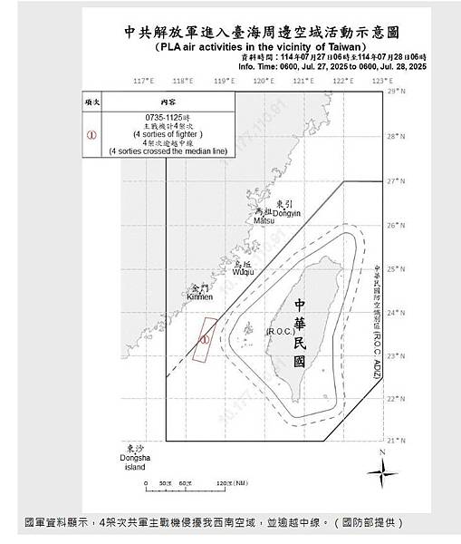 國軍資料顯示,3架次共軍主戰機及無人機侵擾我西部空域,其中1架次逾越中線。(國防部提供)
