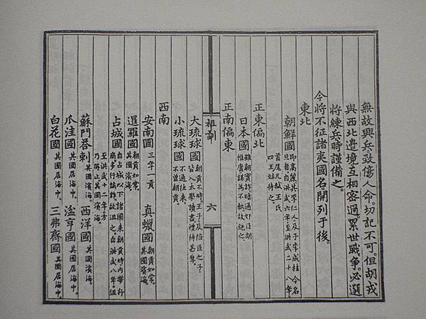 凡海外夷國,如安南、占城、高麗、暹羅、琉球、西洋、東洋及南蠻諸小國,限山隔海,僻在一隅;得其地不足以供給,得其民不足以使令。若其自不揣量,來擾我邊,則彼為不祥。彼既不為中國患,而我興兵輕伐,亦不祥也。吾恐後世子孫,倚中國富強,貪一時戰功,無故興兵,致傷人命,切記不可。但胡戎逼近中國西北,世為邊患,必選將練兵,時謹備之。