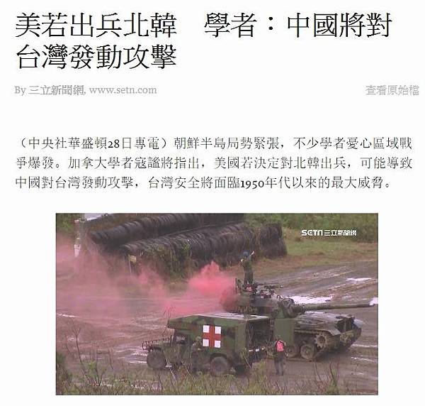 (中央社華盛頓28日專電)朝鮮半島局勢緊張,不少學者憂心區域戰爭爆發。加拿大學者寇謐將指出,美國若決定對北韓出兵,可能導致中國對台灣發動攻擊,台灣安全將面臨1950年代以來的最大威脅。