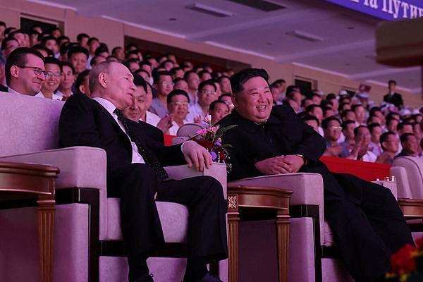 朝鮮官方發布的照片顯示,朝鮮領導人金正恩(右)和俄羅斯總統弗拉基米爾·普丁(左)於朝鮮平壤。本週普丁對朝鮮進行了訪問。