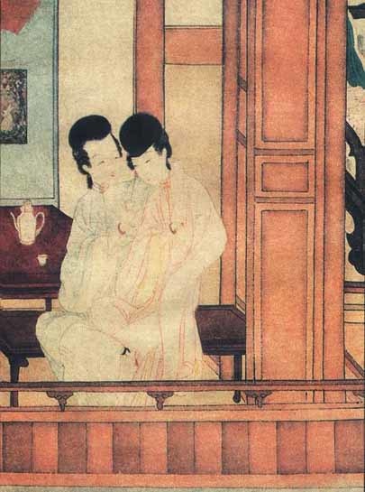 與男性同性戀相比,女性同性戀比較隱蔽。中國古代女子同性戀的易發地點為宮中,君王后宮佳麗三千,皇帝縱有超凡本領,又哪裡臨幸得過來?因此,宮女們的苦悶可想而知。解脫之道,往往是進行自慰,然而,自慰之後愈發空虛孤獨,而同性戀卻不但能使從事者獲得身體上的滿足,還能使她們從性伴侶那裡得到精神上的撫慰,對某些深宮女子因而就更有吸引力。《漢書·孝成趙皇后傳》記漢成帝時,中宮使曹官與官婢道房“對食”,顏師古注曰:“宮人自相與為夫婦名對食,甚相妒忌也。”顯而易見,“自相與為夫婦”就是同性戀活動,可以達到爭風吃醋的地步,由此可見,宮人之間的互相愛戀還是比較深切的。
