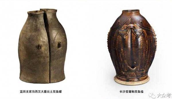 結合陝西及內蒙古兩地的考古發現可知,唐代陶瓷製雙魚形榼是在漢代魚形陶扁壺的基礎上,不斷地發展與完善,逐漸的將分體式融合於一體,並借鑑吸收其它質地的雙魚形器物特點,進而產生的一種盛酒器。