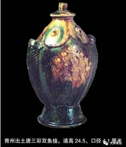 1953 年,山東青州出土了一件唐三彩雙魚榼。榼小口,雙魚相合成器身,口上有蓋,下承高圈足。魚眼球凸出呈黑色,二魚中間各有上下兩隻小鰭,形象逼真,栩栩如生。通體施黃、綠、褐彩,造型新奇,燒制精美,為山東一帶出土唐三彩器中的精品。