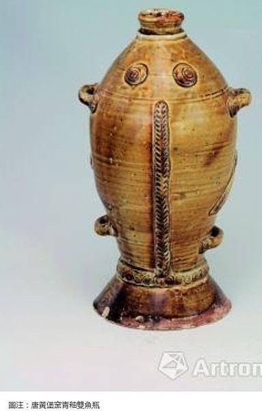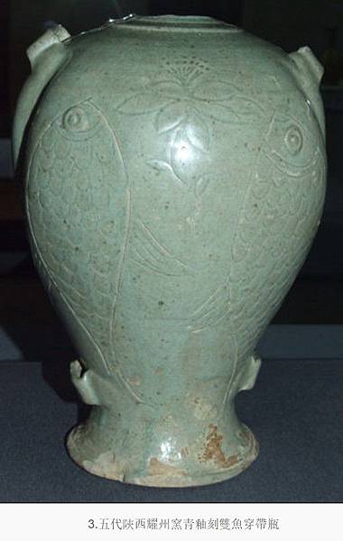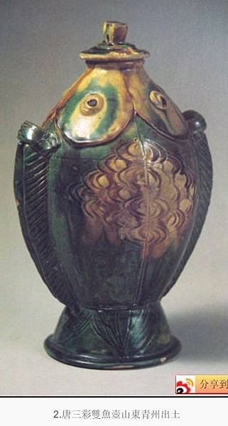 1.唐代廣州梅縣水車窯青釉雙魚形壺1.唐代廣州梅縣水車窯青釉雙魚形壺 2.唐三彩雙魚壺山東青州出土2.唐三彩雙魚壺山東青州出土 3.五代陝西耀州窯青釉刻雙魚穿帶瓶3.五代陝西耀州窯青釉刻雙魚穿帶瓶