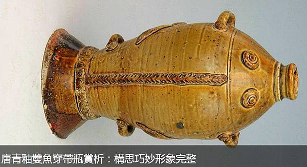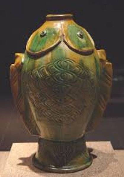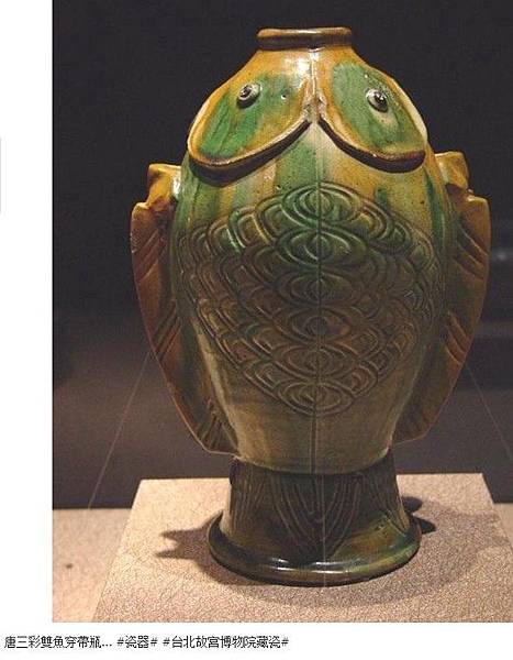 1975 年,江蘇揚州唐城遺址內出土了一件唐三彩雙魚榼,榼體似圓柱形,魚口、目、鱗、脊一應俱全。雙脊間有穿系小孔,便於繫繩,既實用又美觀,反映了晚唐制瓷工匠在設計上的高度造詣。魚眼球凸出呈黑色,形象逼真,並以黃、綠、褐三色相間浸潤,呈現出斑斕的釉色。