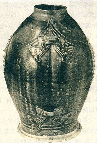 作為白瓷的代表性窯場——邢窯也生產有雙魚形榼,如 1964 年河北井陘縣出土了一件白釉雙魚榼,通體施白釉,口緣及足部露胎,釉色白中閃青。造型呈雙魚躍起狀,魚頭為瓶的口、頸、 肩部,身為瓶身,尾為瓶之圈足。瓶口外侈,腹部扁圓,圈足外撇。瓶身飾滿魚鱗紋,兩側堆塑雙排魚鰭紋,上下均有環形系,圈足置孔,便於穿系提攜。除了此件外,1998 年印尼勿里洞島出水的「黑石號」沉船上也有一件邢窯白釉雙魚瓷榼,造型與長沙窯醬釉雙魚榼較為類似,只是體型稍窄,應為出口之用。