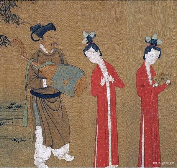 看《歌樂圖》畫面內容,明顯可以分為兩個部分,即中間的人物和兩端的配景。