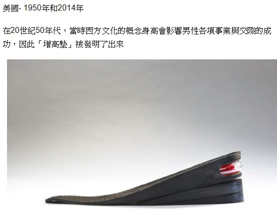 在20世紀50年代,當時西方文化的概念身高會影響男性各項事業與交際的成功,因此「增高墊」被發明了出來