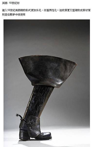 進入18世紀高跟鞋的形式更加多元,依舊男性化。這款厚實又堅硬的皮革材質則是在戰爭中被使用