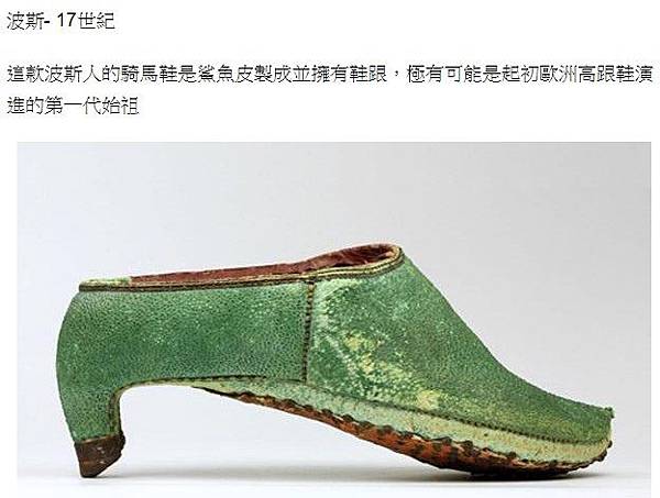 這款波斯人的騎馬鞋是鯊魚皮製成並擁有鞋跟,極有可能是起初歐洲高跟鞋演進的第一代始祖