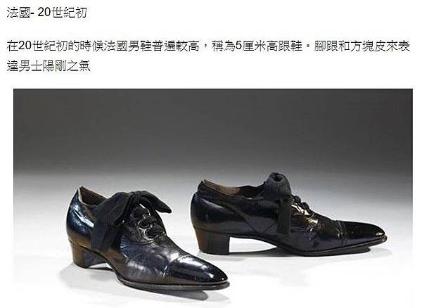 在20世紀初的時候法國男鞋普遍較高,稱為5厘米高跟鞋。腳跟和方塊皮來表達男士陽剛之氣