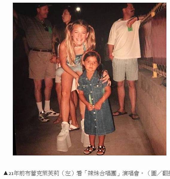 布蕾克萊芙莉日前在IG分享,她1997年去觀看「辣妹合唱團」演唱會時拍下的舊照,照片中,她纖細高窕的身材,頭綁著雙馬尾,穿上亮片超短洋裝,踩著當年流行的高跟長靴,她彎下腰摟著一旁年僅5歲的小妹妹曝21年前追星舊照!一旁雙馬尾粉絲竟是女神 網友全驚呼 | 娛樂 | 三立新聞網 SETN.COM - https://goo.gl/wodA1H