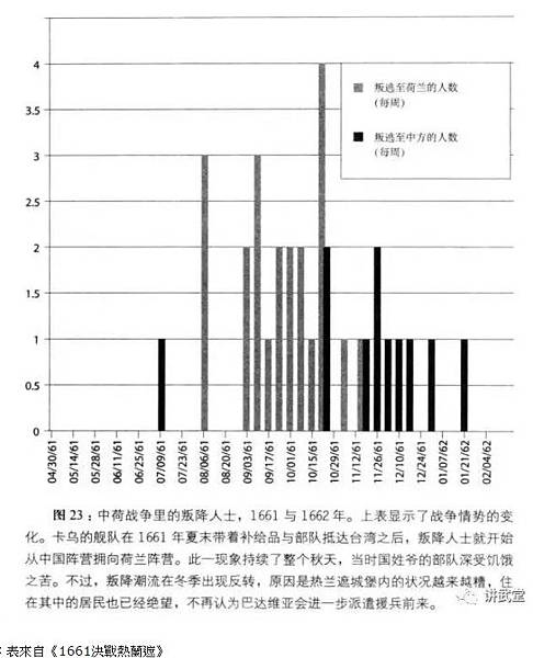 因此,中荷戰爭為我們帶來軍事史方面的珍貴教訓。這場戰役發生的時候,中國與西方的科技水準大致相當,和當今的狀況比較相似,而不像其他的中西戰爭——如鴉片戰爭、八國聯軍以及韓戰,都是發生在西方科技遠遠勝過中國的情況下。軍事史學家向來假定有一種「西方的戰爭方式」,一種「西方獨有的作戰方法……使得歐洲人成為文明史上最致命的士兵」。不過,這種論點的支持者通常對中國軍事傳統一無所知。在中荷戰爭裡,中國軍隊的戰略、戰術與領導作為都較為傑出,且這一切背後的行動守則,都是取自中國源遠流長的歷史,一段與歐洲史一樣充滿戰爭的歷史。我閱讀的中文史料,攙雜了許多古代經典的智慧,如《孫子兵法》與《三國演義》。實際上,中國史學家向來認為國姓爺之所以能夠戰勝荷蘭人,正是因為他精通中國傳統的軍事智慧。