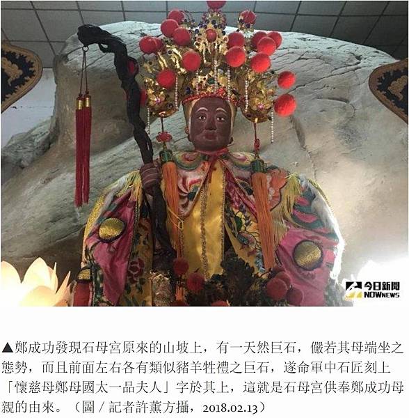 ▲鄭成功發現石母宮原來的山坡上,有一天然巨石,儼若其母端坐之態勢,而且前面左右各有類似豬羊牲禮之巨石,遂命軍中石匠刻上 「懷慈母鄭母國太一品夫人」字於其上,這就是石母宮供奉鄭成功母親的由來。(圖/記者許薰方攝,2018.02.13)