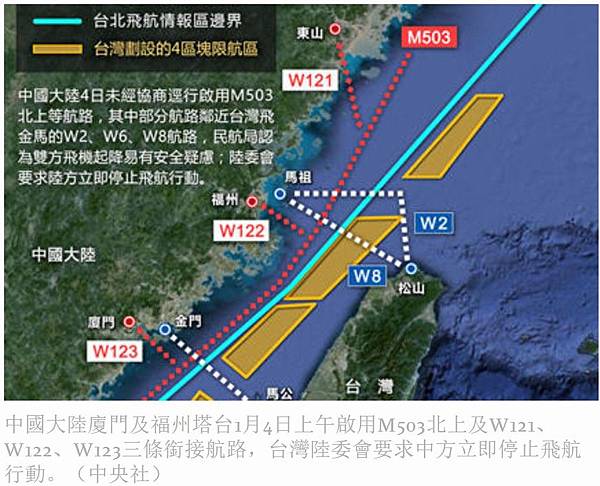 陸委會4日舉行「M503及相關航路啟用事宜」臨時記者會,圖為M503及3W航路示意圖。(記者簡榮豐翻攝)