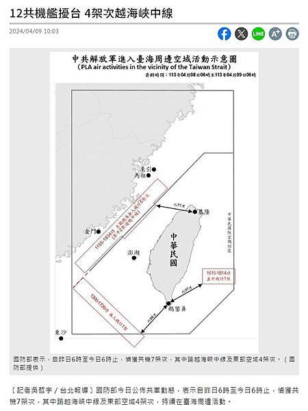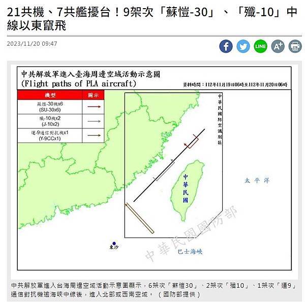 國防部發布共機擾台 18架次逾越中線 - 政治 - 自由時報電子報