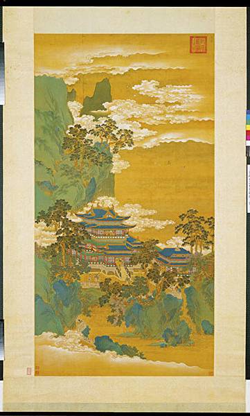 *趙伯駒,宋太祖七世孫,字千里,南宋建炎年間(西元一一二七—一一三○)官至浙東路鈐轄。善青綠山水及木石、兼工花卉翎毛,尤長於人物。宋高宗曾命畫集英殿屏,賞賜甚厚,多作小圖。流傳於世。唐朝李思訓父子青綠山水,五代北宋繼起無人,至伯駒、伯驌兄弟始復振起。 本幅畫仙山樓閣,用色清潤,山腰白雲橫飄,尤覺優雅。本幅為黃君璧先生捐贈。
