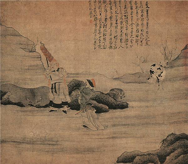 蘇武出使匈奴被羈,守節不屈,徙北海牧羊十九年;李陵出征匈奴,力竭被執而降,武帝誅其家,遂不得歸漢。李陵聞蘇武將返,特來相餞,泫然對泣,不勝哀戚。畫幅中蘇武與李陵握手道別,景物蕭瑟與人物愁蹙的表情相呼應。陳居中,生卒年不詳,寧宗嘉泰(西元一二○一至一二○四)年間,任職畫院待詔。此幅敷色古澹,從畫風看,約是十四世紀中期後人臨本。