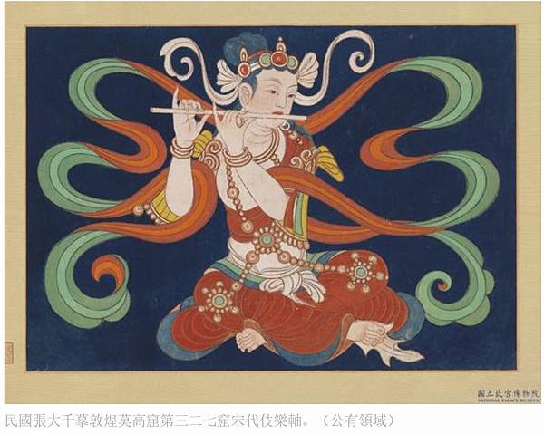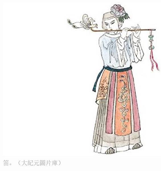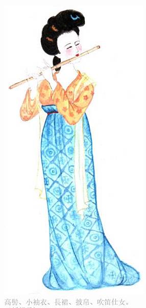 高髻、小袖衣、長裙、披帛、吹笛仕女。 (新紀元)