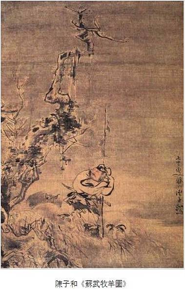 蘇武牧羊圖絹本,設色,藏浙江嵊州市文管會。圖繪《漢書?蘇武傳》中蘇武在北海雪地牧羊故事,是歷史人物畫中較為常見的題材。—般描繪蘇武手持使節,或坐或立,姿態寧靜,神情溫和。此圖則不同,蘇武面部微仰,斜看寒柯,兩袖拱胸前,不僅扶節,而且腰掛佩刀。兩眼炯炯有神,正氣凜然。背景用淡墨烘染,寒氣迫人,襯托出主題人物威武不屈的忠貞氣質。人物、羊群、老樹、荒草,筆墨縱橫揮灑,奔放中不失法度,畫風屬吳偉一路。時代也相接近。陳子和作品傳世較少,此圖為其七十一歲時作,尤為難得。