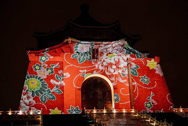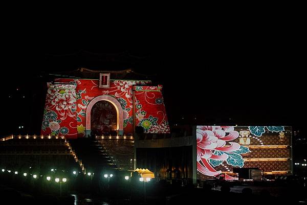 ↑2006年法國精品品牌和台灣藝術家林明弘合作,將中正紀念堂用客家文化的「大紅花」圖案點綴。