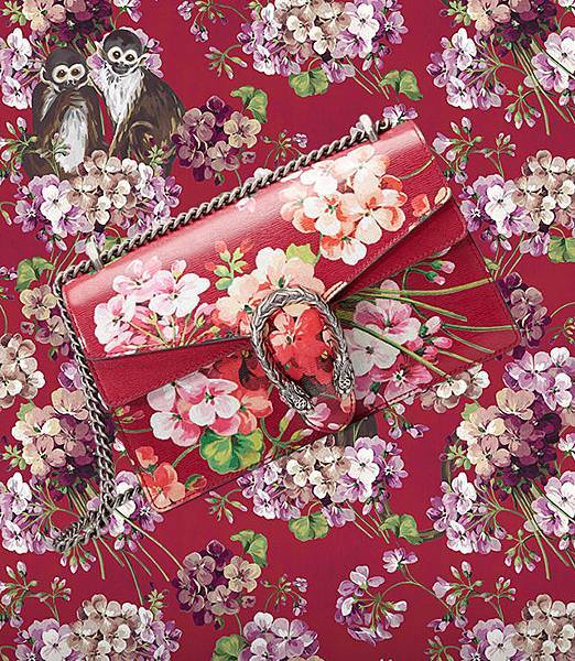 ↑設計總監Alessandro Michele用天竺葵印花加上植物藤蔓印花,以亮麗的正紅色,為新年開春帶來喜氣。