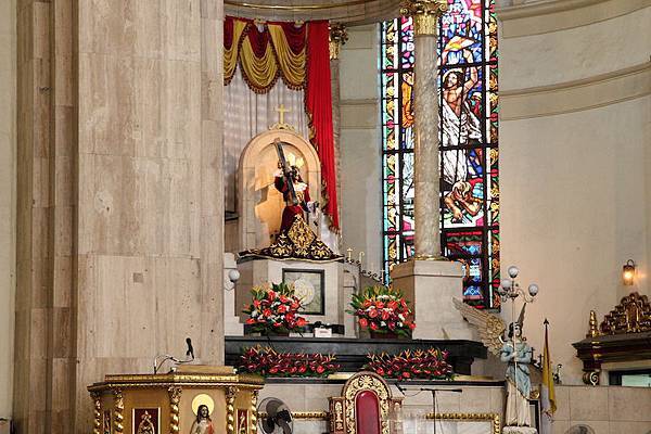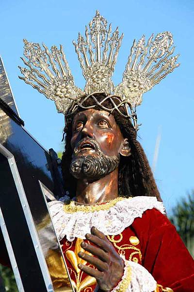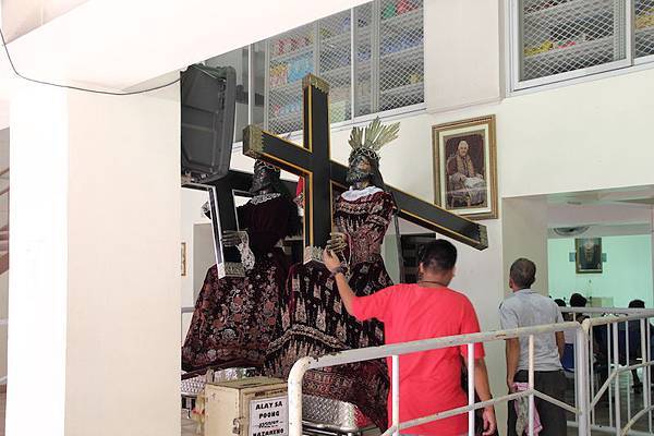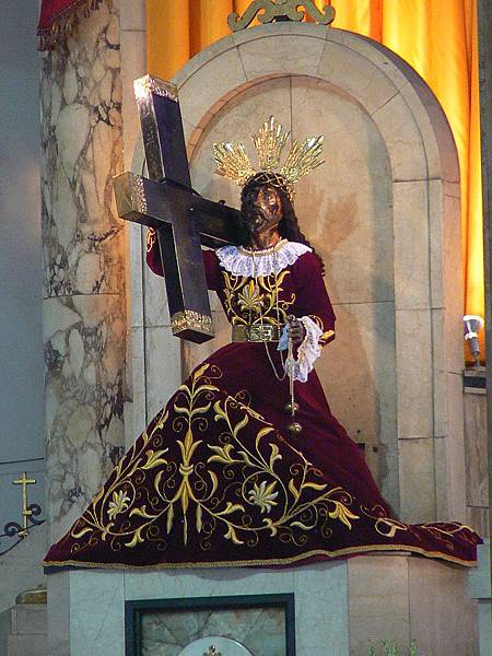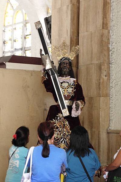 黑拿撒勒人是指耶穌。這尊神像頭戴荊棘、身穿紫袍,右肩扛著十字架,1606年由西班牙神父從墨西哥請到菲律賓,但因船上失火被熏黑,索性漆成黑色,渡海迄今已有400多年歷史。