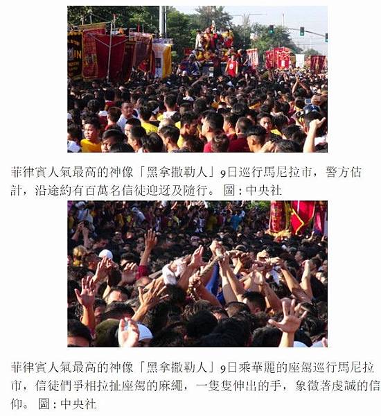 菲律賓人氣最高、象徵耶穌的神像「黑拿撒勒人」今天巡行馬尼拉市,沿途估計約有百萬名信徒迎迓及隨行,許多人拚命爬上座駕試圖親手觸摸神像,險象環生。