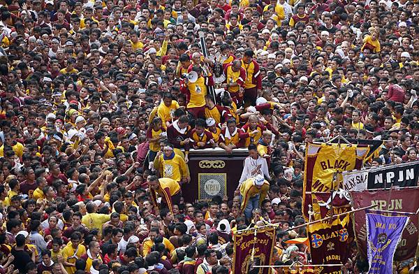 菲律賓人氣最高的神像「黑拿撒勒人」9日巡行馬尼拉市,警方估計,沿途約有百萬名信徒迎迓及隨行。 圖 : 中央社
