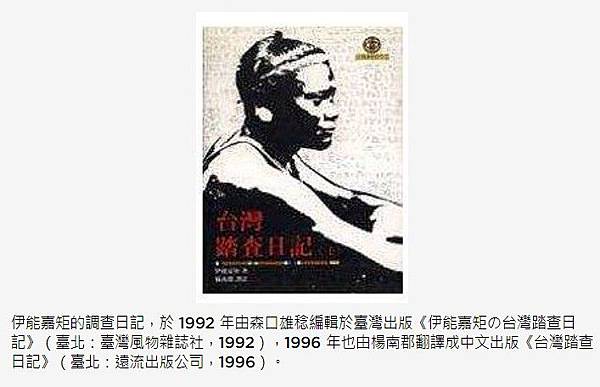 伊能嘉矩的調查日記,於 1992 年由森口雄稔編輯於臺灣出版《伊能嘉矩の台灣踏查日記》(臺北:臺灣風物雜誌社,1992),1996 年也由楊南郡翻譯成中文出版《台灣踏查日記》(臺北:遠流出版公司,1996)。
