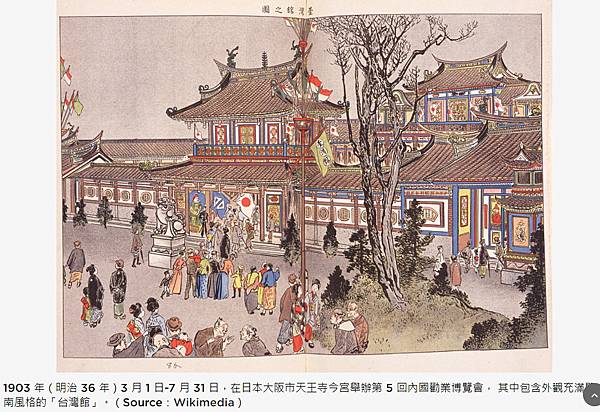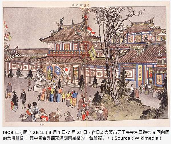 1903 年(明治 36 年)3 月 1 日-7 月 31 日,在日本大阪市天王寺今宮舉辦第 5 回內國勸業博覽會, 其中包含外觀充滿閩南風格的「台灣館」。(Source:Wikimedia)