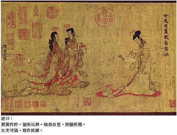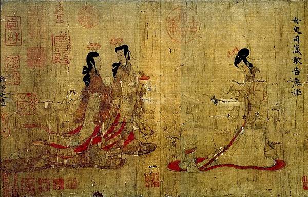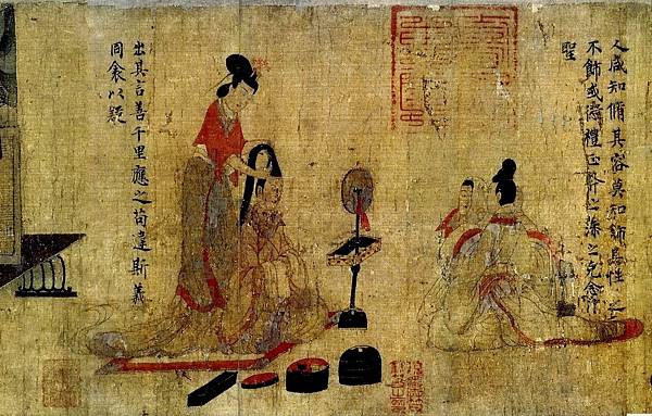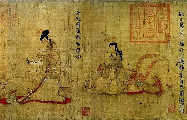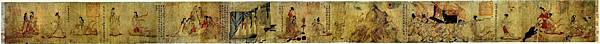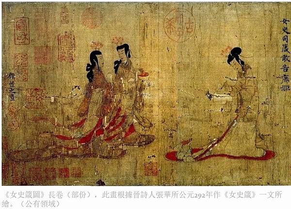 《女史箴圖》長卷,傳為晉顧愷之(345年-406年)的作品,但現代學者普遍認為該畫卷為5世紀到8世紀時期的摹品。此畫根據晉詩人張華所公元292年作《女史箴》一文所繪,《女史箴》用於告誡皇帝後宮中的女性尊崇婦德,此畫卷表現了張華的詩歌。