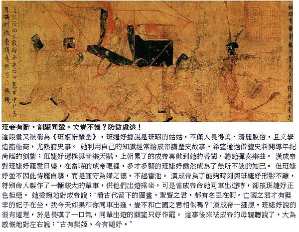當時王太后聽到班婕妤以理制情,不與皇帝同車出遊,非常欣賞,逢人便說:古有樊姬,今有班婕妤。王太后的賞識,使班婕妤的地位在後宮更加突出。
