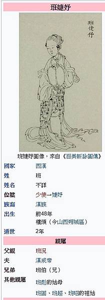 班婕妤(公元前48年-公元2年),名不詳,樓煩人,漢成帝劉驁妃子,西漢女作家,古代著名才女,是中國文學史上以辭賦見長的女作家之一。善詩賦,有美德。初為少使,立為婕妤。《漢書·外戚傳》中有她的傳記。她也是班固、班超和班昭的祖姑。她的作品很多,但大部分已佚失。現存作品僅三篇,即《自傷賦》、《搗素賦》和一首五言詩《怨歌行》(亦稱《團扇歌》)。
