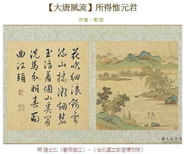 元稹一定是感動得羞羞答答,不管了,先提筆和詩呀,《和樂天秋題曲江》「十載定交契,七年鎮相隨。長安最多處,多是曲江池。 梅杏春尚小,芰荷秋已衰。共愛寥落境,相將偏此時。 綿綿紅蓼水,颺颺白鷺鶿。詩句偶未得,酒杯聊久持。今來雲雨曠,舊賞魂夢知。況乃江楓夕,和君秋興詩。」大抵他寫這首詩時,正是秋天,他眼前,滿目都是秋景。長安城的秋天,水中的芰荷、紅蓼,已在時令裡枝葉衰敗,帶著寒意的風吹拂經霜的草木,煙波浩淼的水邊,有泊岸的漁舟,細腳的白鷺鶿,伶仃地立在舟上,與那水邊的秋菖蒲、蘆葦、芰荷同鏡,是永恆的大唐詩畫。這清冷的畫卷裡,秋風將衣角翩躚,輕拂他們年輕的面容。「共愛寥落境,相將偏此時」。是說他們在一起,總是有許多話要說,這種「寥落境」,不止是瑟瑟秋風,萬木蕭蕭落的秋意,更是心境。長安城中這些年的官場跌宕、遭際亦是心頭的那一種蕭瑟秋意。這一種寥落,也是白居易的感受,「始知知交難」。人世的炎涼帶給了他們磨損,他們確認著彼此的存在,從中得到支持和溫情。