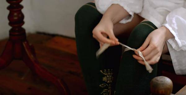先是穿上長筒襪,以布條固定後再穿上鞋子。